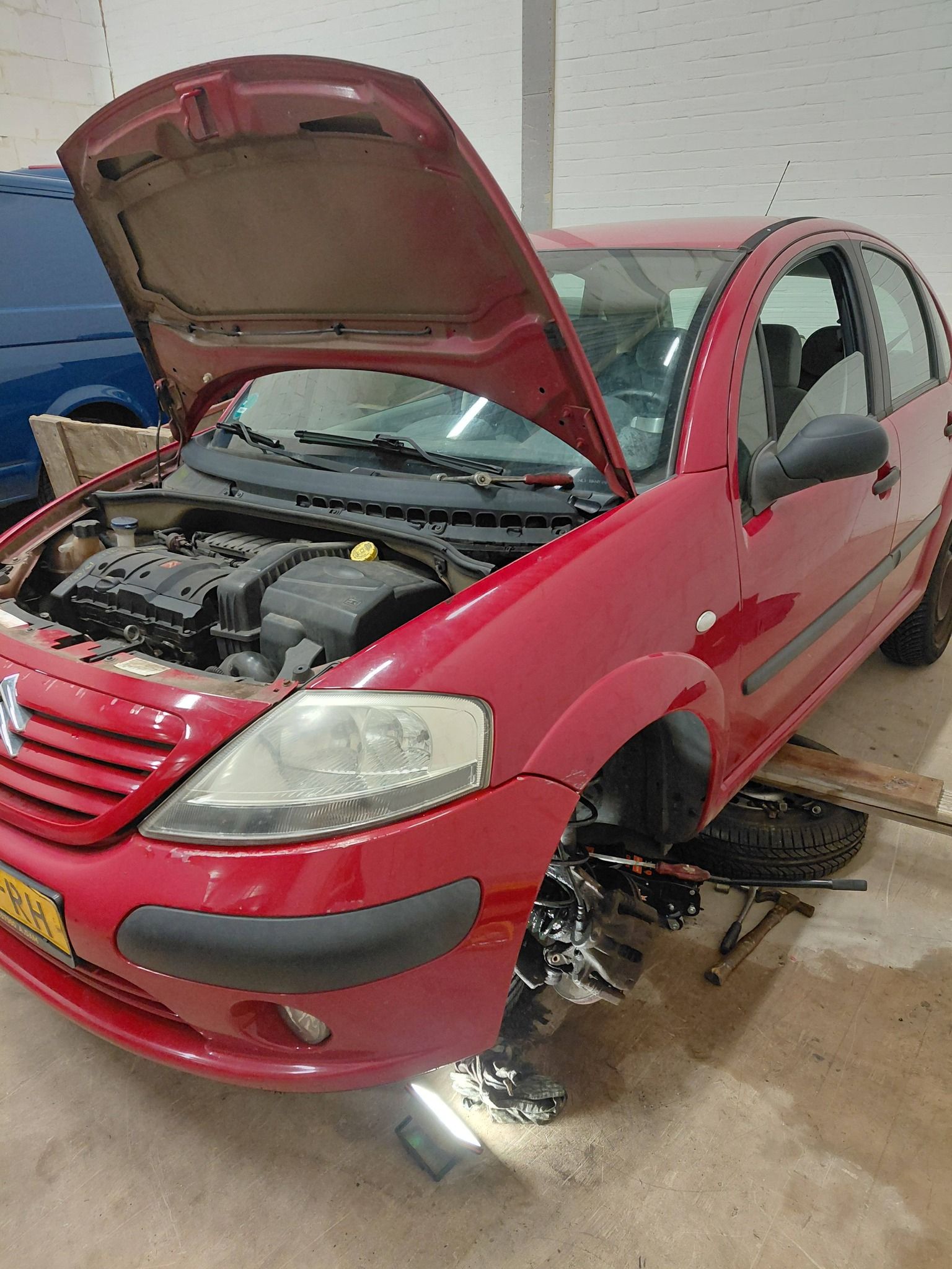 Deze Citroen C3 was bij ons gebracht door de ANWB veerspiraal gebroken, nadat wij hem opgekrikt hadden zagen wij dat dat de gebroken veer meer schade had veroorzaakt zo was de homokoneet en de fuseekogel beschadigd. Wij hebben de veerpoot + spiraal vervangen merk Monroe steekas, fuseekogel en de stuur kogel. Na de reparatie APK gekeurd en beurtje gegeven, Ook deze auto staat nu bij ons in onderhoud.