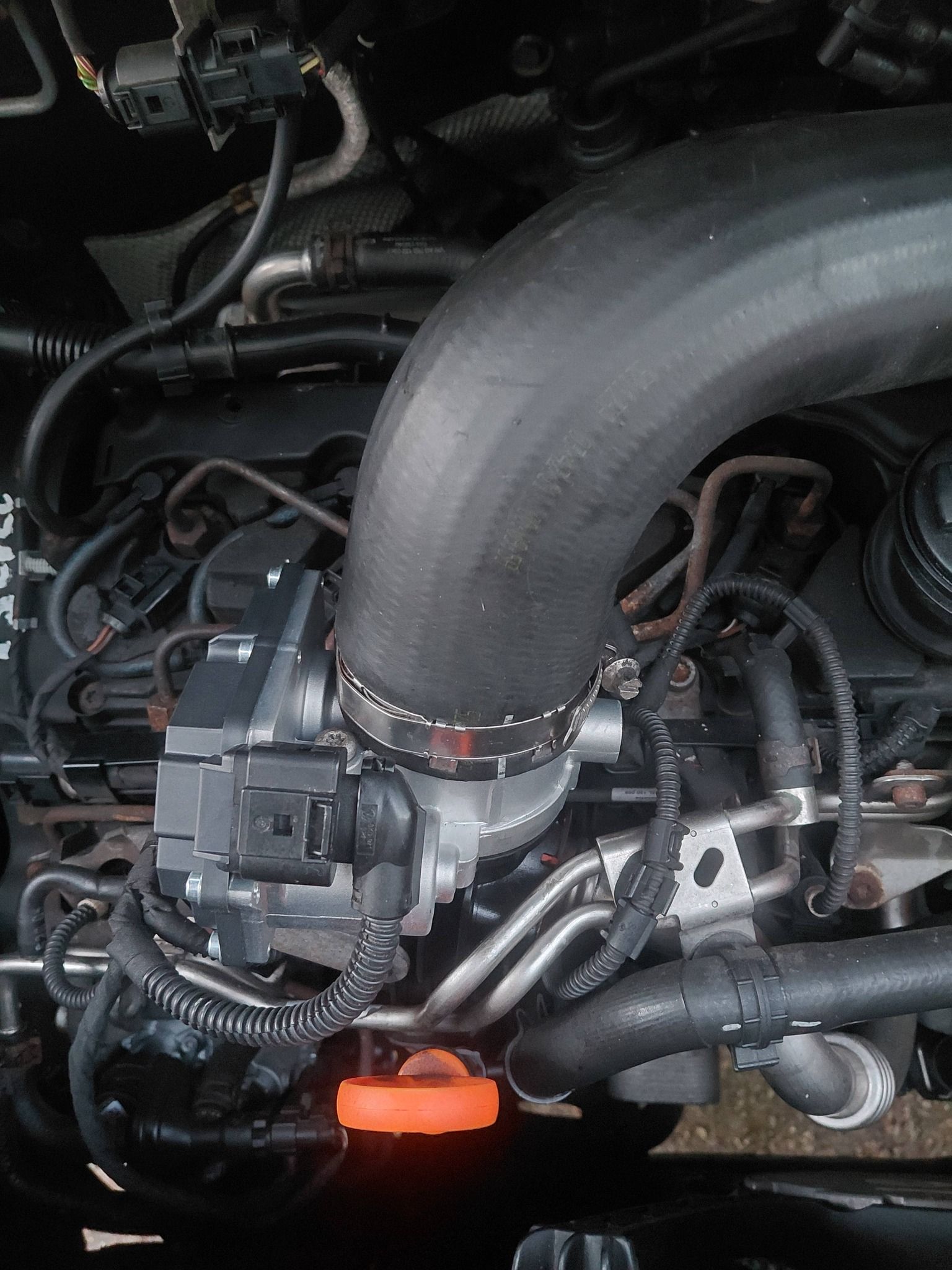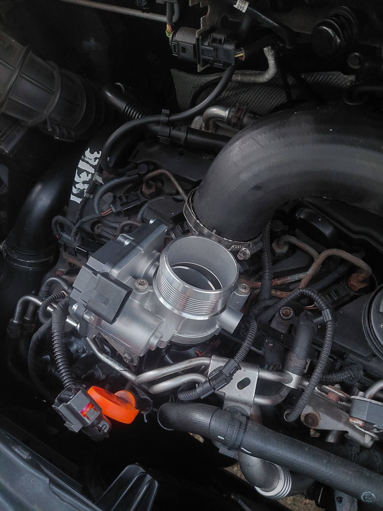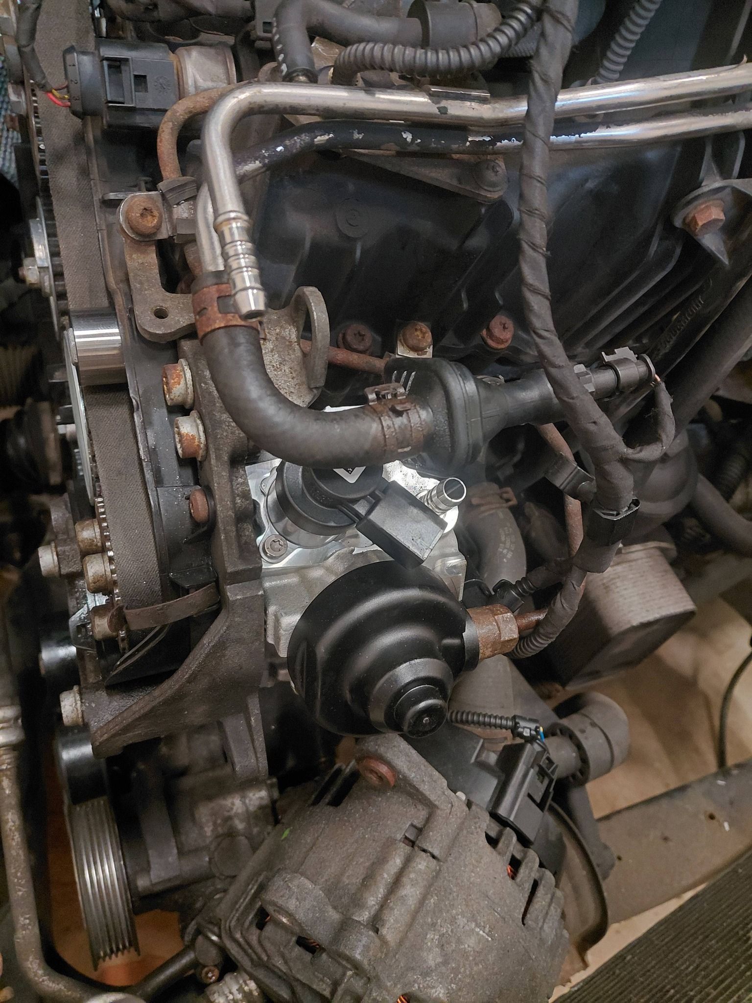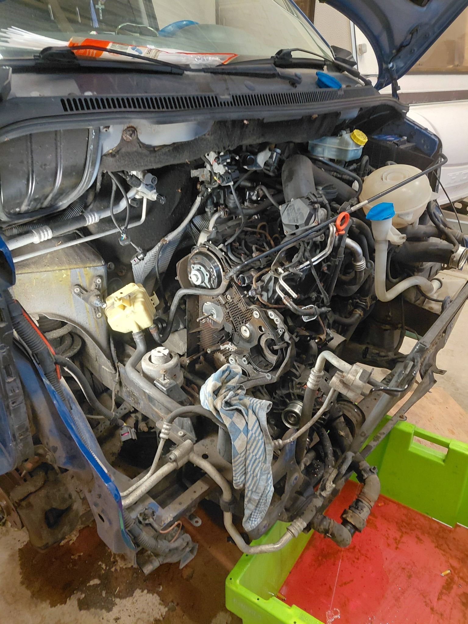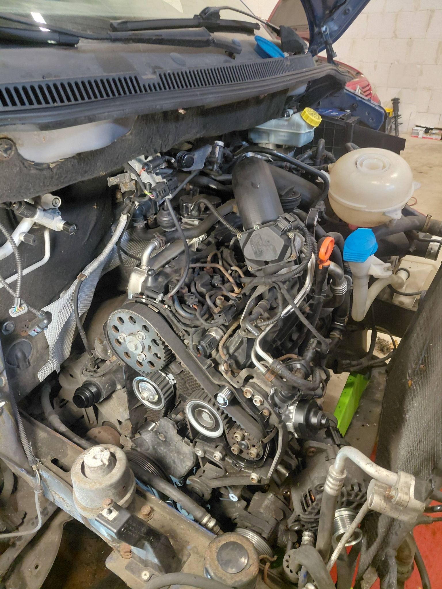 Reparatie Volkswagen Transporter T5 om de werkzaamheden uit te kunnen voeren moest heel de voorkant gedemonteerd worden veel is vervangen bij deze transporter Nieuwe hogedruk pomp, Distributie riem + rollers, waterpomp, v-snaar + rollers en spanners, dieselfilter, olie service + filter en nieuwe EGR huis + koeler, Gasklep huis en de EGR Magneet klep.